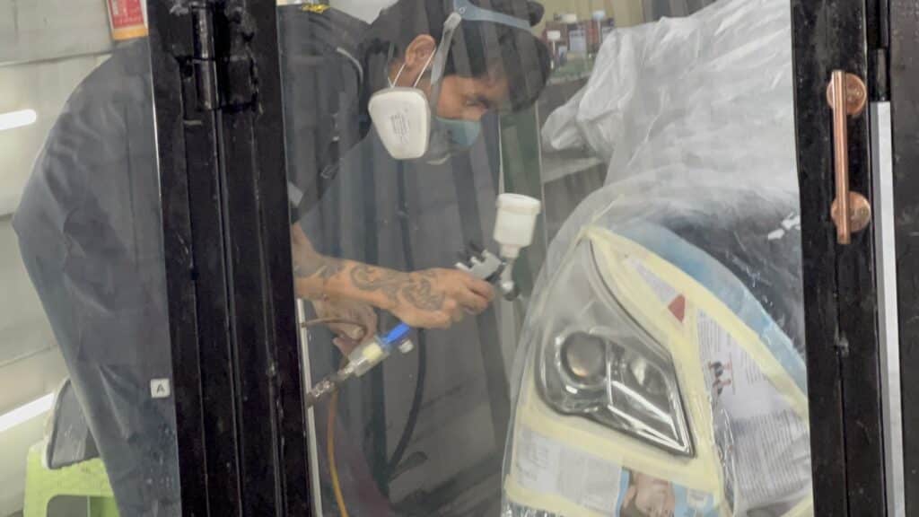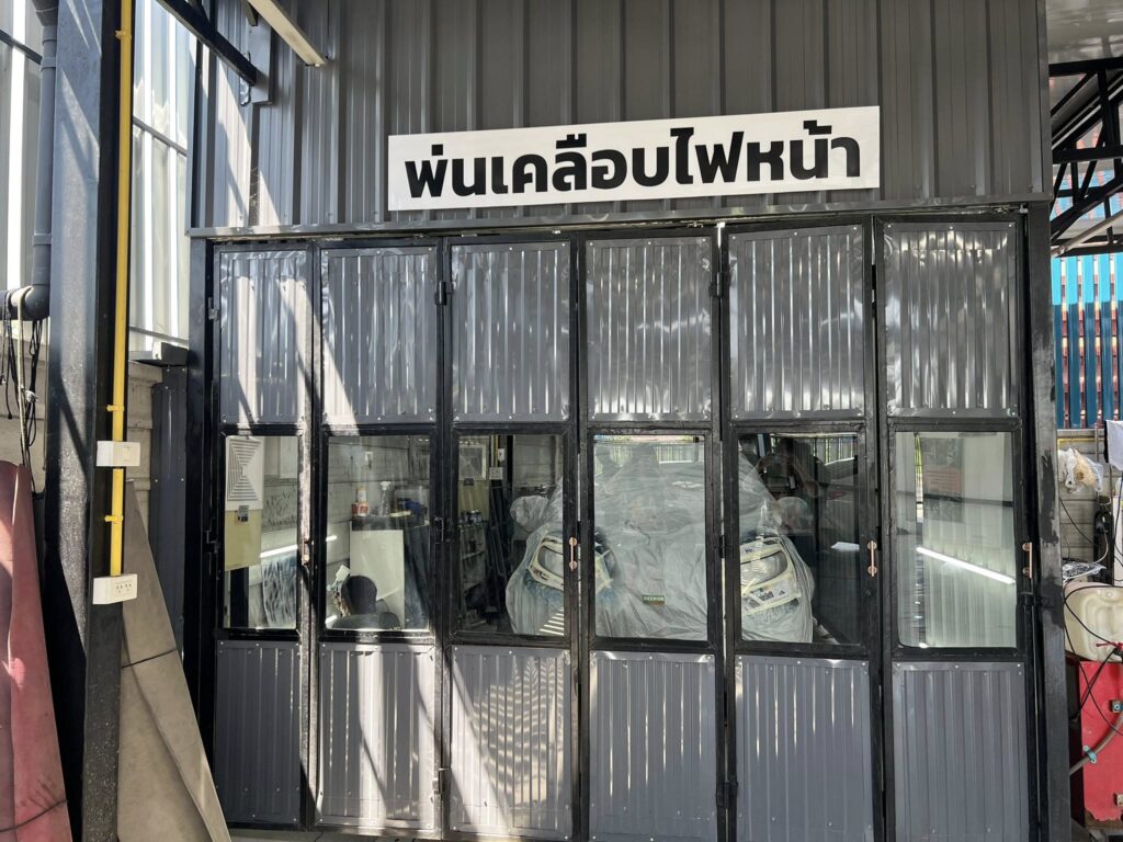 หนึ่งในขั้นตอนสำคัญของงาน ขัดพ่นเคลือบไฟหน้ารถ คือการพ่นเคลือบใน “ห้องพ่นเคลือบ” ซึ่งเป็นพื้นที่ที่ช่วยควบคุมสภาพแวดล้อมระหว่างการพ่นน้ำยา ทำให้งานที่ได้มีคุณภาพดีกว่าการพ่นในพื้นที่เปิดทั่วไป